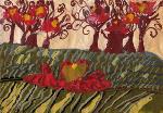 Sus imágenes parecen surgir de la memoria, es un trabajo de introspección. Así el grabado de América Rodríguez cuestiona : “Emigrar Desplazar Adoptar”. No son retratos pero miradas extrañas o invocaciones a algún espíritu o ser sobrenatural, quizá antepasados, para que se manifieste. Inspiran respeto, imponen silencio. El gusto de la artista por la naturaleza guía su búsqueda gráfica, ella juega con la madera, graba motivos decorativos en el linóleo sugiriendo telas tradicionales y sombras. Descubre